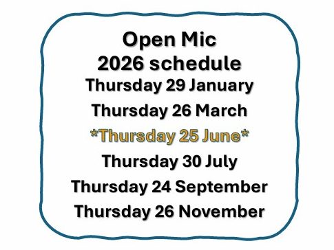 - Psst! The Open Mic reader list fills up quickly! Put the remaining 2026 dates in your diary now so you never miss an event.